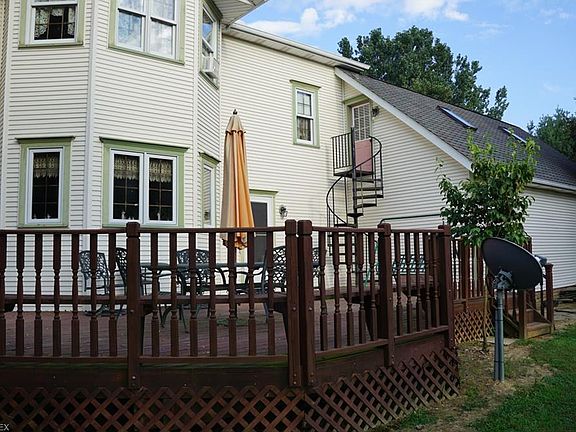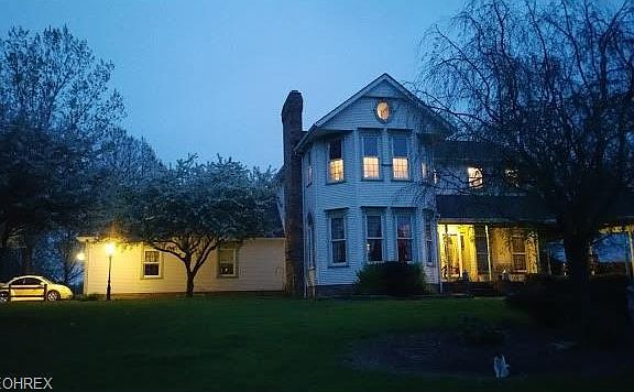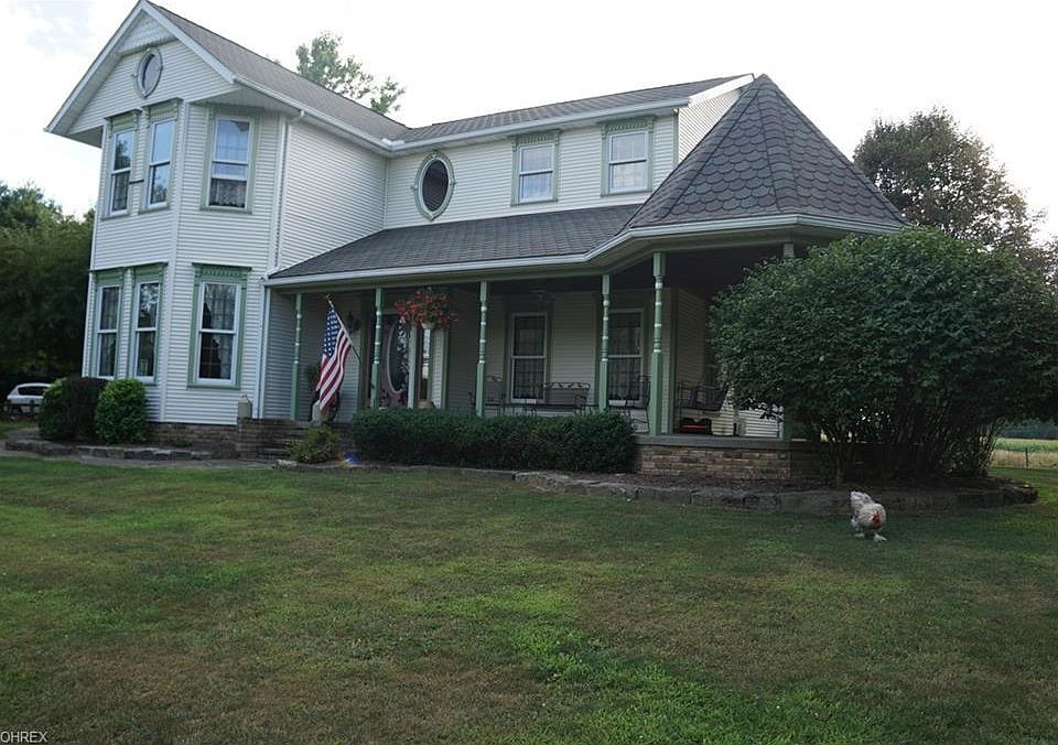 Beautiful Victorian farm house on 5 acres with wrap around porch and 10 foot ceilings. Natural gas, and gas fireplace, An additional wood burning furnace. Solid Oak Doors and Cherry hardwood in the dining room with a vaulted ceiling. Solid oak trim throughout. 8" crown molding and 8" baseboard. Bank barn with 5 large stalls, tack room, and granary. Outbuilding, detached garage with 4 bays. Fenced pasture and small pond. large living room, Beautiful woodwork and so much more. Newer roof on house and barn. Simply lovely.