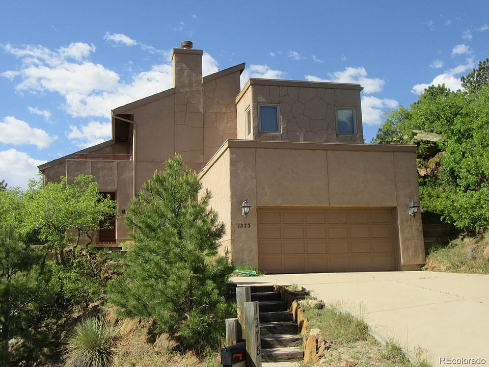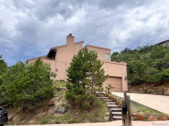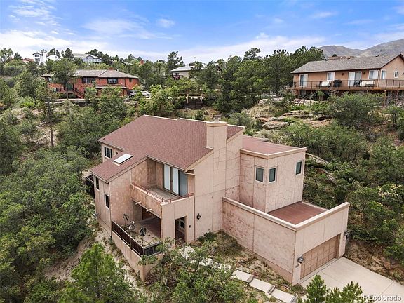 Views, views, views!! Custom adobe style stucco home located in Mount Woodmen Estates! Set into the side of the bluff with amazing city views from all rooms and 5 decks! Scrub oak and rock formations keep the setting natural and in tune with the area. Formerly the builders home, built by Wildman and Wildman. This open floor plan features 5 bedrooms, 3 bathrooms, 2 large living areas, formal dining room and a gourmet kitchen! Granite kitchen counter tops, stainless steel appliances, gas cooktop, and Bosch double built-in ovens! The large formal dining room will accommodate a large table and credenza, and the nice sized, cozy living room with a wood fireplace will keep you warm on those cool Colorado evenings. Enjoy beautiful views to the east from the living room, dining room, and kitchen. The large master suite has views of the Air Force Academy and has a 5 piece master bath and walk-in closet. Walk-out to your private deck off of the 3rd bedroom and enjoy the quite serenity of beautiful rock formations, wildlife and scrub oak. Hand textured walls, tons of storage, central vacuum system, and amazing views! District 20 schools! Close to the Air Force Academy, and easy access to I-25. All information deemed reliable but not guaranteed.