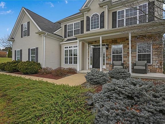Beautiful 4 Bedroom 3 and half Bath Colonial located on a 1.75-acre lot in North Whitehall. This home offers 9 ft ceilings throughout with a 2-story foyer and family room with recessed lighting and a Gas fireplace. Crown molding has been added to every room, custom wood blinds in windows throughout home. Kitchen has Corian countertops with 42-inch cabinets, double sink and breakfast nook, new white oak hardwood flooring recently installed throughout entire first floor. 1st floor also offers a guest bedroom with private bath and office with French doors. Large Master Suite has walk-in closet with custom cabinets, and a spacious master bath with soaking tub. Finished bonus room next to Master Bedroom has 2nd floor laundry and hardwood flooring. Nicely Finished walkout lower level with luxury vinyl plank flooring a gas stove, half bathroom and designated area for a home gym. Exit the basement to an 18 x 15 paver patio with attached fire pit. custom 18 x 13 deck in rear looks out to a nicely landscaped lot with wooded tree line in rear.