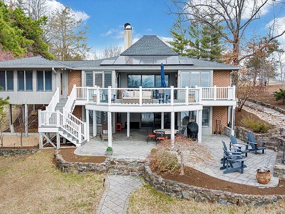 This stunning lakefront home in Stoneridge sits on 1.47 acres with 116 feet of shoreline, offering both privacy and convenience. Easily accessible by land and water, it's just minutes from shopping, dining, and everything Smith Mountain Lake (SML) has to offer.Inside, the warmth of wooden ceilings and rich Brazilian Cherry floors set the tone for a cozy yet elegant retreat. The main level features two primary suites with direct access to a lakeside deck, perfect for soaking in the serene views. The updated kitchen is a chef's dream, boasting three ovens, a Viking gas stove, a breakfast nook, and a formal dining area. A pass-through window connects the kitchen to the great room, which showcases a vaulted wood ceiling, propane gas fireplace, and a sunroom. see more... Additional conveniences include a spacious laundry room.