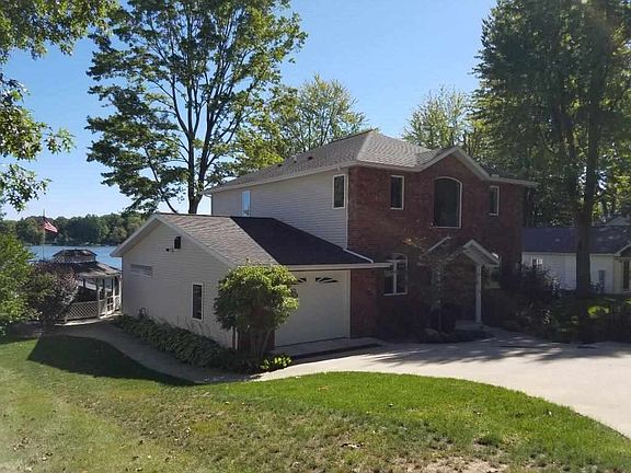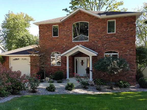 Immaculate high end quality lakefront home with 4 BR, 3 1/2 Baths. 5 cars in garage space across the road. Level lakefront lot with great views. 2 master suites (one on each level). 10' ceilings. Cherry cabinetry, all wood built-ins, flooring, trim & doors. Tile floors. Beautiful kitchen. Lakefront indoor swim spa room. Newer landscaping, heated driveway by home, large gazebo can accommodate lake side dinner parties. Lakefront deck & patio. Large back lot adjacent to a nature preserve with trails. Good fishing including walleye. Connects to Royer Lake.