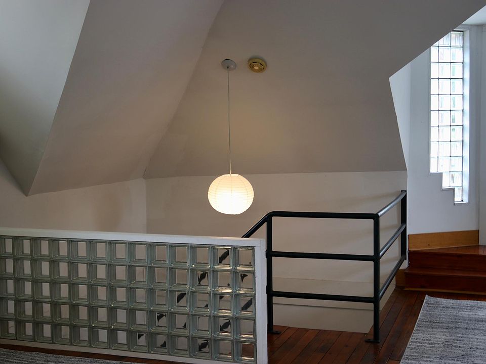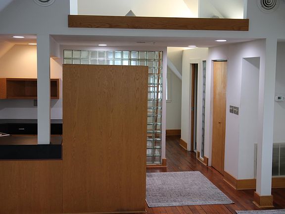 Modern third floor apartment with open plan and loft. This unit gets great light with windows on three sides, French doors to a roof terrace, and skylights. Modern interior with glass block walls, wood floors with rugs, custom kitchen and stackable washer/dryer hookups. Owner pays for water, renter pays electricity. No dogs, cats or smoking allowed.