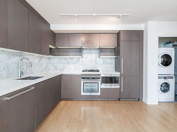 Park Avenue East, 1-bed, 1-bath home for rent offers over 500+ sqft. of thoughtfully designed living space on the 6th floor, complete with a private balcony. The sleek kitchen features quartz countertops, under-cabinet lighting, soft-close drawers, S/S appliances & a gas cooktop with pull-out hood fan, while wide plank laminate flooring, built-in cupboard organizers & venetian blinds add both style & function. A spa-inspired bathroom with marble accents & a custom backlit vanity mirror, along with in-suite laundry, provide everyday comfort. This rental includes 1 parking & 1 Storage. Enjoy amenities including an outdoor terrace with pool, spa/hot tub, sauna/steam room, gym, lounge, tennis court, theater & concierge. Located mins from SkyTrain, T&T, Kwantlen, SFU, Surrey Hospital & more.