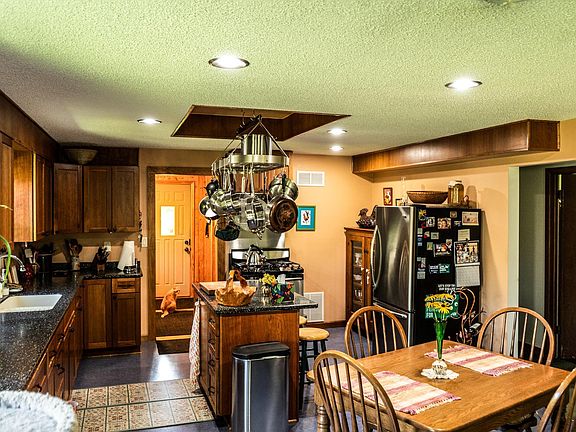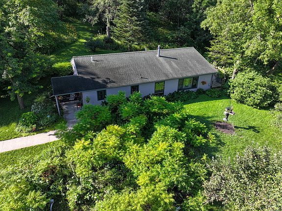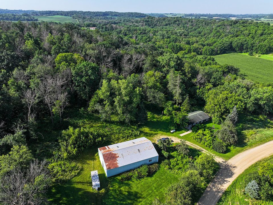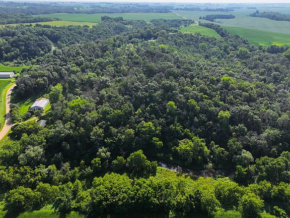 2-bed, 1-bath home on 25.46 acres at 13750 315th St, Cannon Falls, MN. Features cherry cabinets, Corian countertops, wood stove, fiber optic internet, pole shed, and Belle Creek running through.