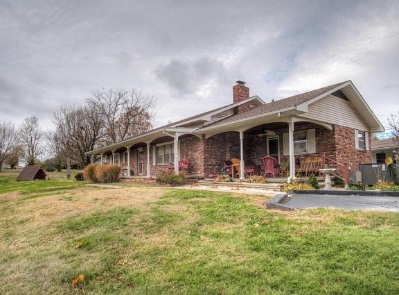 Country setting, close to town! This 3bed/2bath ranch has a remodeled kitchen, large living area with wood-burning fireplace, plus all of the extras! Expansive front porch with an amazing view, inground pool with attached, screened-in porch, large 2-car detached garage & metal barn plus a 1-car detached workshop & carport. House is spotless with original hardwood floors, great layout, & a kitchen with rich, knotty Alder cabinets. Outside is a storm shelter with a roof against the elements for peace during storms. The long tree-lined drive welcomes guests and family while the beautiful 2.85 acres offers pretty views all around. Call for your tour today!