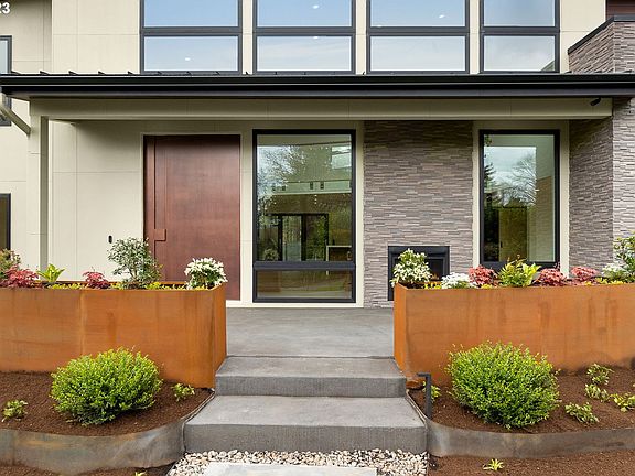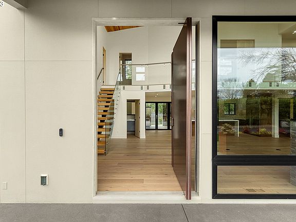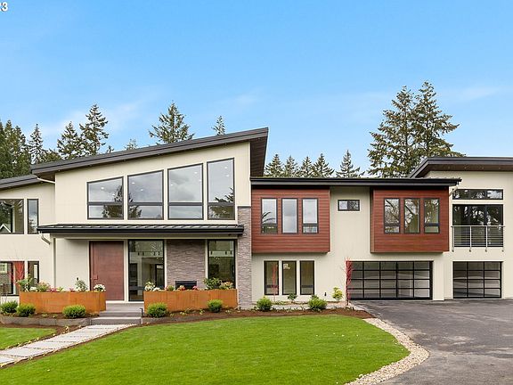 Dramatic custom contemporary perfectly situated on quiet half-acre lot in Lake Oswego. Open design inspired by clean lines and modern elegance is softened and enhanced by the warm textures of natural elements including wood, stone, ceramic tile, and rich metal finishes.Patina planters flank the front entry and a private sitting area with fireplace provides a serene welcome. The 10 ft pivoting front door opens to a breathtaking great room. The 25 ft cedar lined ceiling, huge windows framing the east west exposure and abundant sunlight, wide plank oak engineered floors, fireplace, and floating stair system seamlessly set the stage for an exceptional lifestyle.The gorgeous kitchen with Wolf/Sub Zero appliances, huge island, and butler pantry with sink and second dishwasher provide inspiration for the most exacting chef. Steps away, the large dining area invites lingering and conversation. The meticulously designed main floor includes a guest suite, stylish mudroom with storage and mechanical room with space for a shop/hobby area.Large folding glass doors off the kitchen open to the beautiful fully fenced yard. Expansive covered patio with outdoor kitchen and stacked stone fireplace, sunny open area with additional seating and gas fire feature, heated saltwater pool and Far Infared sauna.Upstairs, the luxurious primary suite has a massive custom fitted closet adjacent to the office/work-out room and spa bath with heated tile floors and towel rail, and soaking tub. A private balcony overlooks the yard. An additional suite, two additional bedrooms, bonus and laundry room are also conveniently located on this level.State of the art systems throughout. Pre-wired for security cameras and speakers. 3 car garage with aluminum and glass doors and two EV charger points. Electric gates at the front and rear driveway entrances. Don't miss the opportunity to experience this one-of-a-kind property.