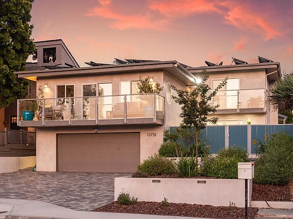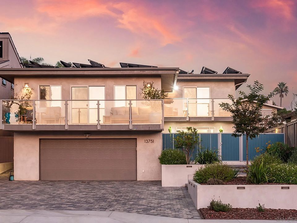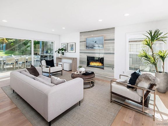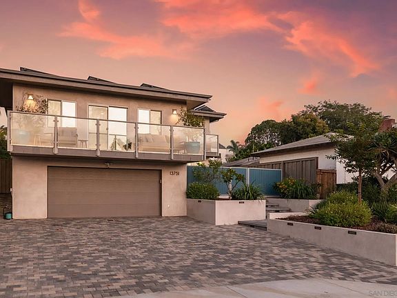 Discover modern living at 13751 Mercado Dr, a 5-bedroom home in Del Mar that merges impeccable design w/ practicality, emphasizing comfort & elegance. The entryway, w/ striking hardwood floors, leads to a spacious, open living room w/ floor-to-ceiling stone fireplace, recessed lighting, & a large sliding door to a lush backyard. The kitchen caters to culinary enthusiasts w/ polished quartzite countertops, chic cabinetry, & top-tier appliances, including two Bosch dishwashers, an AGA Induction Range w/ triple ovens, & an integrated Sub-Zero fridge & freezer. The ground floor features a contemporary bathroom w/ a stylishly tiled shower & modern vanity & large laundry area. Heading up the staircase, you will find a spacious bedroom w/ west-facing balcony.The large closet features a porthole window & easily fits a sofa, desk, & tv which allows this space to be used as a private lounge or home office. The 2nd floor has 3 sizable bedrooms, a secondary bathroom w/ built-in storage, & luxurious primary suite w/ a private west-facing balcony. Additional highlights include: sophisticated window treatments, owned solar panels, Burtek battery, water filtration system, tankless water heater, & garage w/ epoxy-coated floor. The backyard, perfect for entertaining, includes a custom playground & shed, fruit trees, fire feature, & large patio w/ pebble pavers. Located just minutes from One Paseo, the Del Mar Highlands, & Del Mar Village shopping & dining hubs, this home is also close to renowned Del Mar & Torrey Pines Beaches .