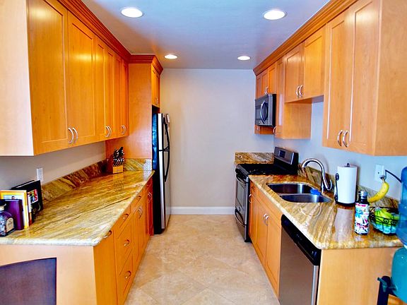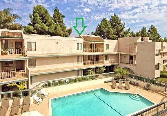 Comfortable upper-floor unit featuring travertine and hardwood flooring, stainless steel appliances (dishwasher, sink, gas stove, and refrigerator), and dual-pane windows. The bathroom includes a marble countertop and updated fixtures. Enjoy views of the landscaped common area with pool, jacuzzi, and BBQ area. Located west of I-5, just minutes from Del Mar beaches. Security-gated complex with one dedicated covered parking space. Gas and water included; tenant pays electricity. No pets, non-smoking unit. One-year lease required. Gas and water paid. Tenant pays electricity.