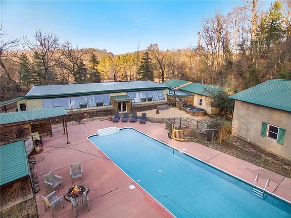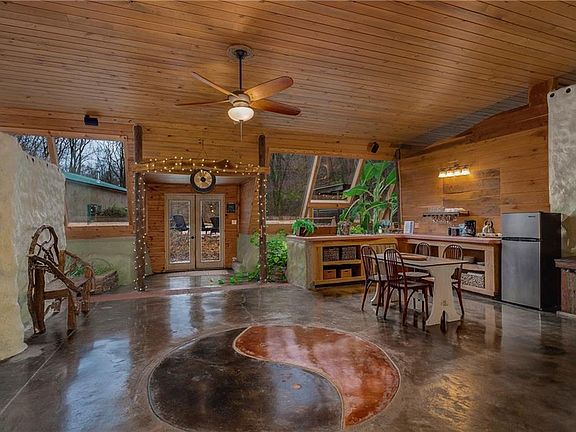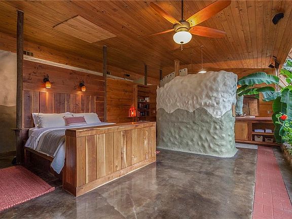 FULLY FURNISHED, ALL UTILITIES PAID! This 6 Bedroom (3 King, 1 Queen, 2 Full + a bonus air mattress) Earth Ship home is hand built and self sustaining. Features a giant circular "Hobbit" door for entry, hand packed and hand painted walls, GIANT indoor plants that are naturally watered by recycled rain or shower water, and a large pool with outdoor shower. Luxury bedding and luxury white towels throughout. There are two fully stocked kitchens (one in the "straw house" and one in the "tire house") for your convenience. One kitchen table seats 14, while the other smaller kitchen seats 6. The main living space features GIANT ceilings, wooden beams, and a large Smart TV. We have Wifi throughout though it is strongest in the "straw house." The space is entirely sustainable and is built to maintain heat/coolness naturally and has central heat and AC and two wood burning stoves.