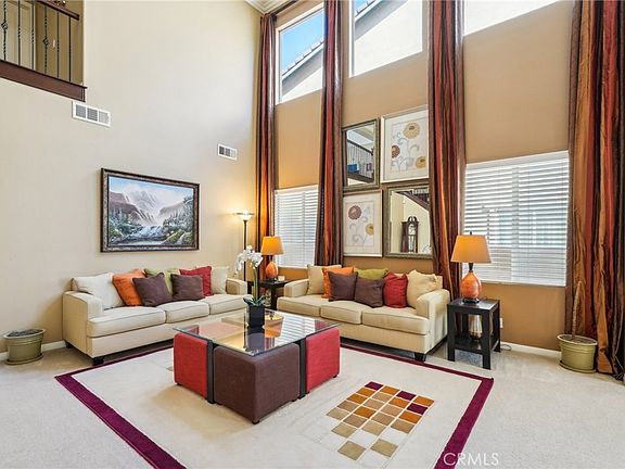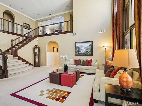 As you enter, you're greeted by soaring 18-foot ceilings that enhance the grandeur of the open-concept floor plan. The interior showcases custom crown molding, intricate woodwork, and a striking iron rail staircase, all contributing to the home's sophisticated ambiance.
