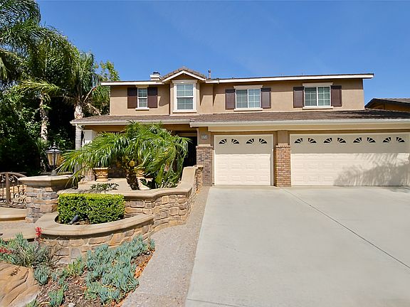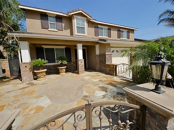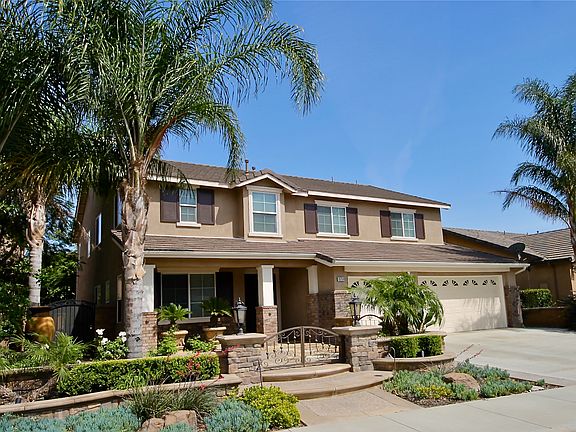 Fabulous curb appeal you will love the custom front patio with stone & stamped concrete, gorgeous fountain, palm trees, wrought iron gates & colorful garden! Enjoy a spacious floor plan featuring engineered hardwood flooring, vaulted ceilings, 5 bedrooms (one on the 1st floor), huge loft and 3 bathrooms. The formal living room flows to the formal dining room. Spacious family room features a raised hearth fireplace & media niche; it opens to the large kitchen with a center island, breakfast nook, granite counter tops, granite/tiled back splash & tons of storage space. Double staircase leads to an immense loft under a vaulted ceiling that is perfect for your game room, office space & more! The master suite has double doors, a vaulted ceiling, raised hearth fireplace & retreat. Inviting bathing quarters include a soaking tub, separate shower, dual sinks, granite counter tops, separate vanity & walk-in closet. Enjoy the private backyard with a built-in BBQ island, pool, spa, fruit trees & mature shade trees. Take a closer look at one of the most beautiful homes on the market!