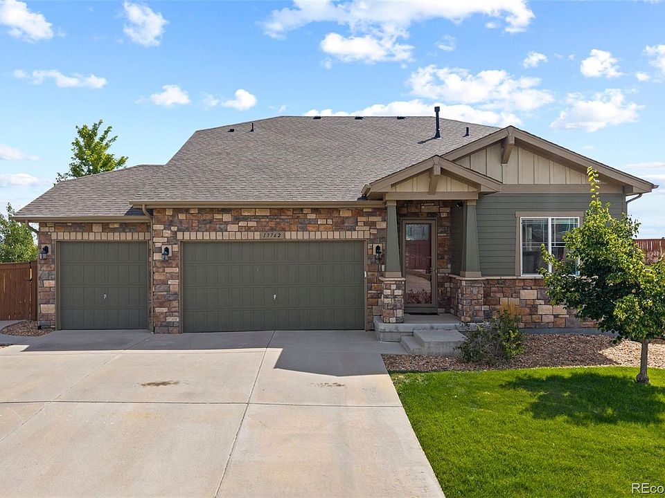 Are you tired of looking at real estate photos online and then being disappointed when you see the place in person? That stops today! This listing is truly picture perfect. This meticulously maintained home absolutely feels like new and offers the increasingly rare combination of no metro district and a low HOA. Backing to open farm fields, this property provides a sense of space and tranquility. Inside, an impressive 10-foot front door is accented with custom stained glass that opens to an expansive living area with vaulted ceilings, 8-foot doors, and three private ensuites. The gourmet kitchen is a chef's dream with granite countertops, a gas range with a vent hood, a pot filler, and under-cabinet lighting. Entertain in the formal dining room or snack in the dining nook, with additional bar stool seating at the kitchen island, or top off your glass at the custom dry bar with extra cabinet storage. The main living area features a cozy fireplace, and surround sound is wired throughout the house for your enjoyment. The five-piece master suite includes a professionally installed closet system. A builder-finished, full basement offers recreation and gaming space as well as an additional non-conforming bedroom space that is currently used as an office/flex room. The oversized 3 bay garage with 8-foot doors provides ample room for large vehicles and storage is fully drywalled and complete with an EV charging outlet. Enjoy the outdoors from the covered patio overlooking the landscaped yard with exterior lights on a timer and no neighbors to look into your private yard from behind. This home is complete with a security system and cameras for your peace of mind and was recently painted to make it shine like the day it was built! Schedule a showing before this one gets away.