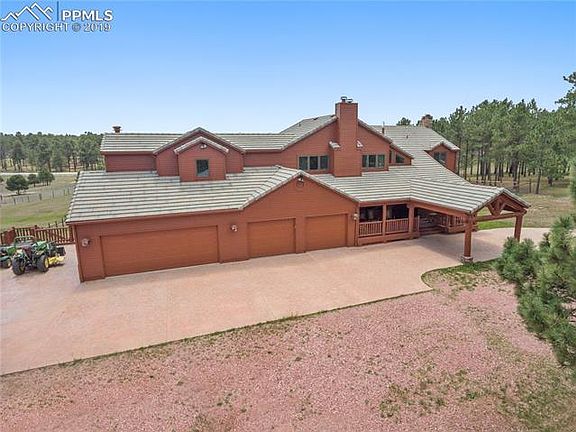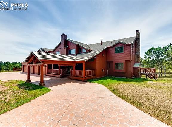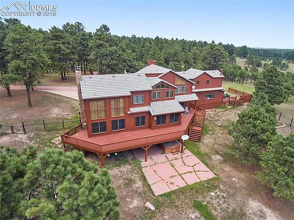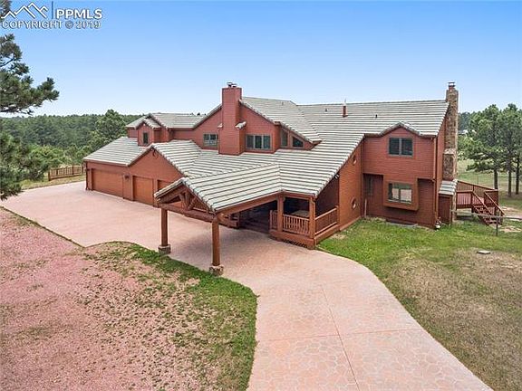 Amazing Jackson Hole inspired, custom home on 10.4 acres w/ two wells w/subdividing possible. In central Black Forest, this hard to find larger lot is fenced, w/ a perfect mix of large, mature, Ponderosa & meadow. Tucked away, sitting on a hilltop, this Art Klien wood sided home features lodge style architecture complete w/ multiple antler chandeliers, lodgepole staircase & log accents throughout. 20 ft wall of windows overlooks the acreage & creates beautiful light within the home. Welcome to the Black Forest lifestyle! Come into the gate of the home with its brick pillars and drive under the carport to enter the front door with log steps and railing. The main level consists of an office with gas fireplace, 1/2 bath, custom kitchen with commercial stove and venthood, subzero with drawers, and 2018 custom, drawered freezer, huge main level laundry complete with cabinetry. The kitchen features granite, a cook's island and overlooks a morning area or nook for perfect eat in mornings. This also leads into a formal living and dining room with the high ceilings, gas fireplace, and a walkout to massive decking that wraps the entire length of the home with log railing and stairs. The upstairs features two bedrooms with a jack/jill bath, an updated master 5 piece bath w/ new tile & granite. The master suite has a gas fireplace, a sitting area and features a 400 sf, custom master closet. The basement walk out features a 4th bedroom, full bath (remodeled), a rec/family area, plus a media room. The heated 4 car garage plus a storage shed, and a heated/ac dog kennel with runs. Home has hot water heat, many custom features, and separate garage boiler for heated driveway. Wonderful setting and creative architecture, fabulous location