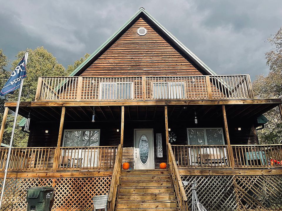 Stunning newer A frame cedar sided home close to the city limits, just off of blacktop. With a large 38'x8' wood deck on the lower level as well as a 38'x8' balcony off of the upstairs bedrooms, this home offers the perfect fusion of indoor outdoor living! You'll be able to appreciate the majesty of the old growth timber which envelops the home on the well proportioned 3 acre lot! Indoors, the vaulted ceilings throughout the home offer an open, airy feel perfect for anyone who enjoys a spacious place to live! Custom oak cabinetry in the kitchen as well as some stainless steel appliances add a touch of class perfect for making your favorite dishes! The full basement is currently unfinished, however, the interior walls have been studded out. Call 816-381-0579 to view.