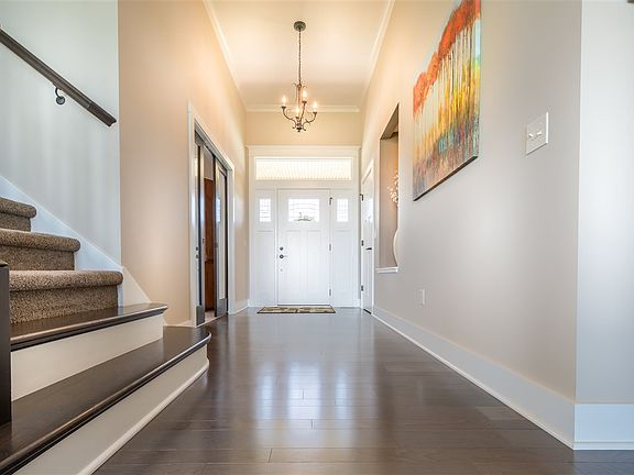 Amazing Bob Buescher home in Grey Oaks. Home on half acre, professional landscape, panoramic water views. HOA includes pool, close to walking trails/schools and more. Grand open floor plan has vaulted ceiling in greatroom, and beautiful wood flooring throughout. Formal dining has french doors, and flows into gourmet kitchen with large center island, breakfast area, and boosts of granite, glass tile backsplash, stainless steel apliances, maple stained cabinetry, abundant storage, and walk-in pantry. Off the kitchen is a big laundry room with builtin cubbies/storage bins, folding counter and cabinets. Enjoy the cozy hearth room with stone fireplace, or entertain on the beautiful stamped patio while enjoying outdoor surround speakers, large back yard and beautiful ponds. Main floor master features 10' trey ceiling, track lighting, large window seat, on-suite bath with dual sinks, whirlpool jetted tub, walk-in tiled shower. Master walk-in closet features built-ins and vaulted ceiling to store off seasonal clothing. Upper level has guest suite with private full bath, walk-in closet, and a panoramic view that goes on for miles. Bedrooms 3 and 4 connect by Jack and Jill bathroom, and has access to walk-in attic storage. Lower level has wet bar, large family area, room for pooltable and an abundance of natural lighting. Features a full bathroom, large storage room, potential for 5th bedroom, den or media/workout room. Large 3 car garage has utility sink, built-in peg board, and access to attic. Features surround sound, security system, complete irrigation system, and remaining Bob Buescher Home Warranty.