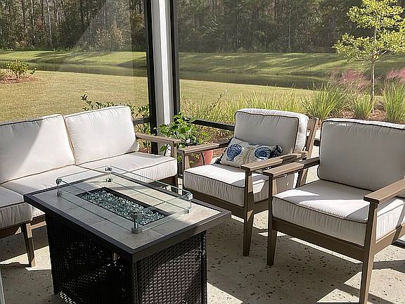 Latitude Margaritaville. You could be living in paradise, NOW! This Jamaica Villa is situated on a lagoon with a wooded preserve lot and an easement offering lots of open space. Enjoy sitting in the screened lanai or sunning on the open patio. The kitchen is tastefully decorated with glass and stone tile, 42” cabinets topped with crown modeling, deep pullout soft close drawers, quartz counter tops, gas slide in range and glass pendants. Enjoy dining at the peninsula or entertain your guest in the dining area. Relax by the fireplace in this cozy but spacious living room. The living room and master bedroom are enhanced with beamed ceilings. The master bedroom easily fits a king sized bed dresser and nightstands. The master bathroom upgrade includes a step down shower with an expanded glass enclosure and quartz counter tops. Flex room enclosed with 8ft glass French doors easily used as a home office, den or spare bedroom. LVP and tile flooring throughout this home.