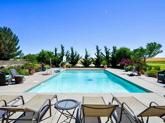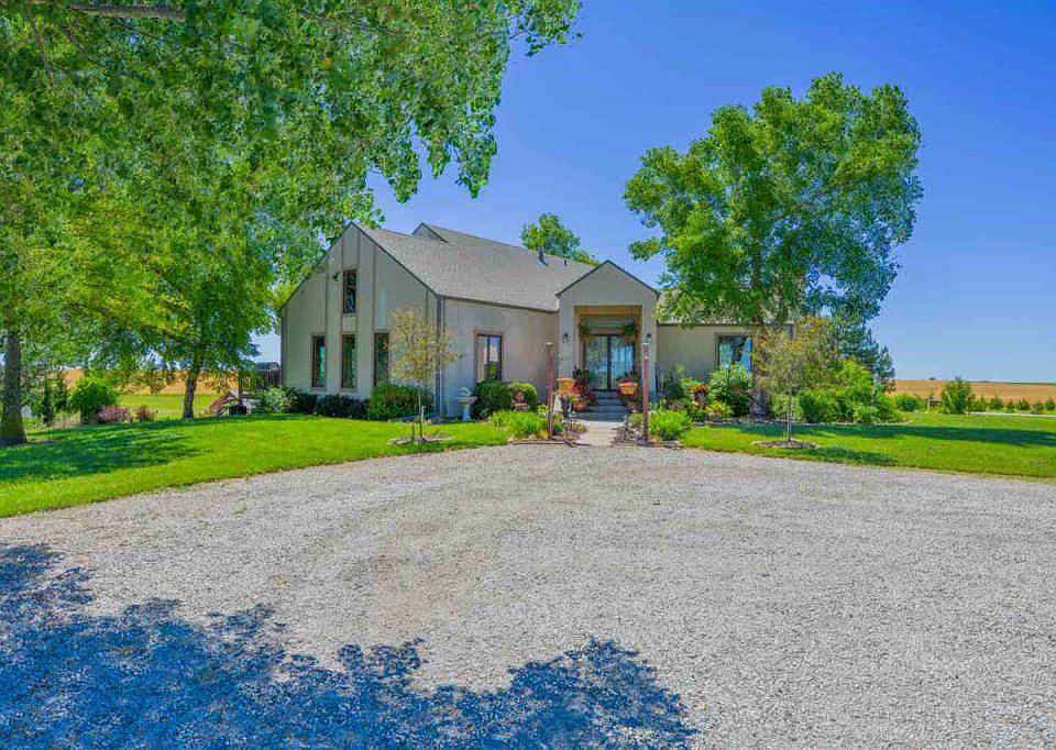 This beautiful property is carved out of wheat field on a black top road. Pond, Tennis/basketball court, Sport Pool is your entertainment. 40x50ft outbuilding on concrete floor with RV and Welder outlets. This lovely home has 6 bedrooms and 4.5 bathrooms. 2 Laundry areas main and upstairs. Incredible open floor plan with dark cherry woodwork. The home is over 5000sqft 1 1/2 story with modern architecture . Upper floor features 3 large bedrooms with their own baths and walk-in closets and cedar storage room. Master suite is on the main level with private door to the patio, super large walk-in closet. Master bath features jet tub, 6ft walk-in shower with double sinks. Main floor formal living room with Wood burning Fire place with gas start. Amazing Hearth/dining/kitchen area with solid surface counter tops tile backsplash, Jen-Arie 3 zone cook top, Micro confection microwave, oven and compactor. Pantry and over the cabinet lighting with nice tall ceiling and big eating bar this all walks out on to the deck area. Walk out basement with wet bar/full kitchen 2 bedrooms, bath and shelved storage room. One bedroom has its own access to the patio/pool area with Gazebo. Basement has sound absorbing ceiling. Private Drive and Pave Rd your buyers will love this beautiful property. Approx. 30mins from Wichita.