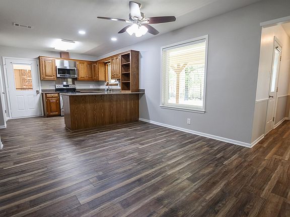 Welcome to this charming 4-bedroom, 3-bathroom home situated on 2.9 acres, offering the perfect blend of comfort and country living. A welcoming front porch invites you inside, where the spacious living room seamlessly connects to the kitchen and dining areas. The kitchen features a breakfast bar, electric range, over-the-range microwave, dishwasher, pantry, and a cozy kitchen-eating combo—perfect for everyday living. The primary suite boasts a nicely sized bedroom, a walk-in closet, and an ensuite bathroom with a vanity and a shower-tub combo. One of the secondary bedrooms also has its own private ensuite with a shower-tub combo, while the other two bedrooms share a Jack-and-Jill bathroom with a shower-tub combo. Additional highlights include a utility room with a sink and an extra room with large shelving—ideal for storage or a workspace. Step outside to enjoy the fenced backyard, while beyond the fence, you'll find a chicken coop, a 20x14 metal building, and a defined trail. The home is connected to a two-car garage via a breezeway, adding both convenience and charm. Recent updates include a 2024 roof, 2021 & 2025 flooring, 2025 fresh paint, and more! Don’t miss the opportunity to make this beautiful property your own!