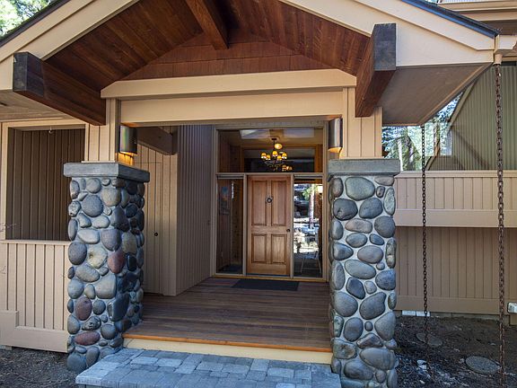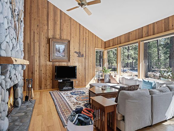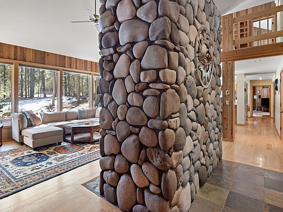 Classic Northwest crafted home on a large half acre lot backing to National Forest land with mature ponderosa pines! The privacy, setting and location of this home is truly unmatched! One step inside and you will see and feel the quality of construction, materials and woodwork used throughout this home. Features include numerous stone & wood accents, high vaulted ceilings, two gorgeous river rock fireplaces, one with gas assist, open great room floorplan, oversized wood wrapped windows and numerous skylights, gorgeous tongue & groove hardwood flooring, SS appliances including dual ovens, large butcher block kitchen island with prep sink, wood paneled family room with wet bar, sink and refrigerator, main level primary suite & second primary suite upstairs, loft area with built in desk, cabinets, and shelving and an oversized laundry room with a laundry shoot. Other features include, wine room, garage storage room, garage workbench, expansive back deck, built in BBQ and newer hot tub.