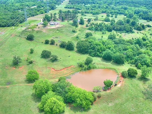 Come up your shaded driveway, through mature trees, to your personal sanctuary on a hill with a stunning view!!! Leave the cares of the world behind! 2233 s. f. brick home overlooks 33.93 acres mol of fenced and cross fenced native pasture with a pond. Home office is glassed in patio flex room that has a split unit for H & A. This room could be used as a 3rd bedroom, exercise room, craft room, plant room, or home-schooling area. Adjoining the home office is a 14 x 28 screened in patio that is the perfect 'bug-free fresh air cookout and relaxation station' to get together and enjoy the stunning view! There are 2 additional bedrooms, 2 updated and remodeled bathrooms PLUS a walk-in storm shelter with 12" concrete walls. Huge living room with a cathedral ceiling accented with wood beams. Woodburning fireplace features a 'Quadra-Fire' metal heatilator insert. Roofing and decking new 2023. Washer and dryer and refrigerator can stay; they are working but not warranted by the sellers. 30 x 31 metal shop with an overhead door and 110; 24 x 32 detached two car garage with 110 plus graveled parking and a 110 outlet for a camper. 25 x 18 metal carport that is 11' tall at the peak, deep enough for a 'tagalong' trailer. Discontinued personal vineyard. 5 car capacity includes 1 car attached, 2 cars detached and a 2-vehicle carport. Steel framed 3 bay livestock shelter: corral paddock and cattle chute. POND! This property offers a combination of privacy, utility and natural beauty-perfect for hobby farming, ranching or simply enjoying rural life with the convenience of being close to town. Lake Thunderbird is minutes away. Enjoy kayaking, canoeing, rafting, boating, fishing, horseback riding, biking, hiking or just watching the wildlife and the people! Thunderbird Casino also close by. The OU Campus and TAFB is easily accessible. All information deemed to be accurate and is subject to buyer verification of all, including but not limited to schools.