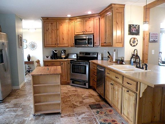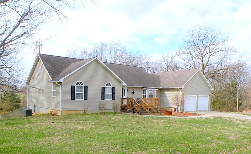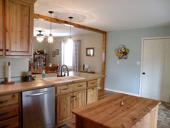 Spacious updated 3 bedroom, 2 bath home on the outskirts of town. Gorgeous kitchen, stainless steel appliances, ceramic tile floor, lots of storage space. Hardwood floors in living room & dining room. Master bath has tiled walk-in shower. Full unfinished basement is plumbed for bathroom. New patio doors & windows in basement. Oversized two car garage. Located on nicely landscaped lot. Deck overlooking wooded area.