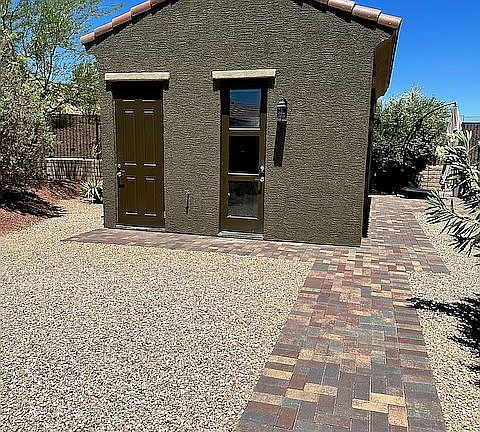 Why wait months to build new when you can buy this Pursuit model NOW! Looks brand new with 4 beds 3 1/2 bath, storage room with A/C and heat with sink in 4' extended garage on a .28 acre lot fenced with pool, views and privacy. Before you step into this immaculate home you are greeted by courtyard and upgraded stone plus pavers in front, driveway and side of the house. As you enter the home you will notice a stunning bling chandelier, attractive laminate wood floors and built in entertainment center with fireplace. The open kitchen has granite counter tops with chiseled edge upgrade and upgraded espresso color cabinets with modern hardware and stainless steel appliances. There are tray ceilings in the foyer and gathering room, ceiling fans in the gathering room and all 4 bedrooms. The primary bedroom has door out to the patio pool area and the bath has upgraded tiled shower and sun tunnel in closet. Pool has gas heater and solar heat was added in 2023. A 308 sq ft Casita was added in 2023 with a wet bar, bathroom with tile shower along with an expanded paver patio. Not only will you enjoy this beautiful home, you have access to Sun City 30,000 sq. ft. recreation center with indoor and outdoor pools, tennis, pickle ball and bocce ball courts, putting green and discounted golf at Conestoga and discount at 1880 Grille.