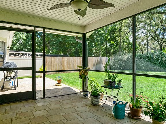 Beautiful updated home that has been Lovingly maintained. The home has a large Open floor plan and is a split plan with Engineered hardwood throughout. The Kitchen has Granite counters and new cabinets with pullouts. The master bathroom has been newly updated. Wood shutters in front window, bathroom windows have shutters and all other custom window treatments stay. Private backyard with pavers in the screened lanai and matching pavers on connecting uncovered patio. New hurricane rated garage door and new opener. There are Fans in all bedrooms and living room and all updated lighting. Updated Security system panel with smoke detector hook up. Outside lights are on timers. MUST SEE!!