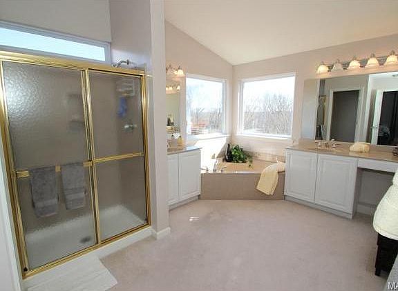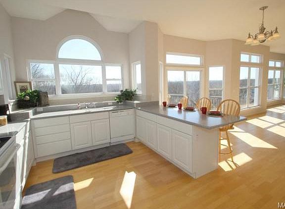 STUNNING two story shines with cascading windows & gorgeous view for all seasons. Natural light floods the kitchen & great room! 10 foot sky reaching vaulted ceilings loom over the sprawling Great Room! Unique 10 Ft. ceilings on main floorprovide an open feel. Gourmet kitchen offers solid surface countertop, exquisite windows, breakfast bar, walk in pantry, pull outs in cabinets. Custom Butler Pantry perfect for entertaining! Vaulted master bed opens to luxury bath suite w/ vaulted ceilings, separate soaking tub & shower! Upstairs loft has your choice of uses! Generous sized bedrooms feature shared Jack & Jill Bathroom! Bedroom #4 has it's own private bath w/shower! SO MANY EXTRAS! Oversized laundry rm, desk/work area. ZONED H/C, 2- 50 gallon HWH, Fireplace wood or gas hook-up. Transom windows throughout! Great room & all bedrooms wired for ceiling fans, 27x14 deck with steps. Deep garage. W/O lower level. Rockwood Schools close to Gravois Bluffs/shopping. Must see!