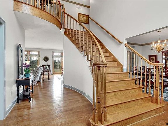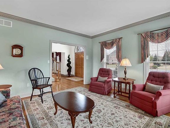 All brick custom Kinsley built 2 story. Custom Weir kitchen with island wet bar and granite tops, 2 master suites with luxurious baths (one with fireplace), crown moldings, family room with masonry stone fireplace, apex vinyl deck with awning overlooking open space, walk out rec room to a patio area. Home warranty included.