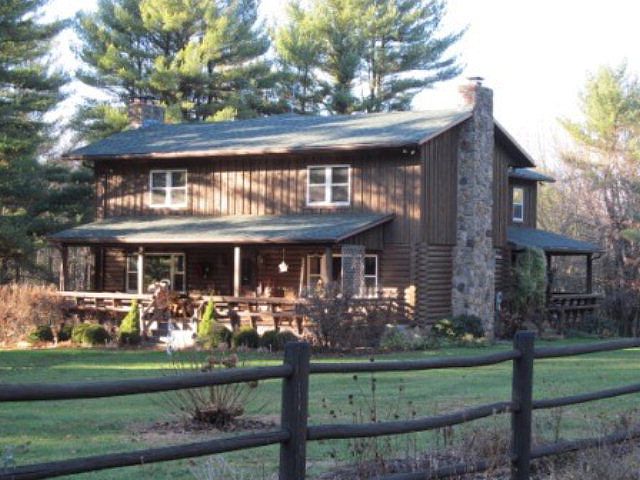 At the end of a private lane, you'll discover this distinctive true log home set among lofty trees on a beautiful, landscaped lot. The spacious floorplan, ideal for entertaining & family gatherings, offers a fully equipped country kitchen with large center island & wood stove, and impressive dining room, a living room and den each with its own fireplace, and 4 oversized bedrooms. Relax in COMPLETE privacy on an expansive deck with a wood and WATERVIEW of a small lake. Rustic Charm, beautiful setting and amenities galore.