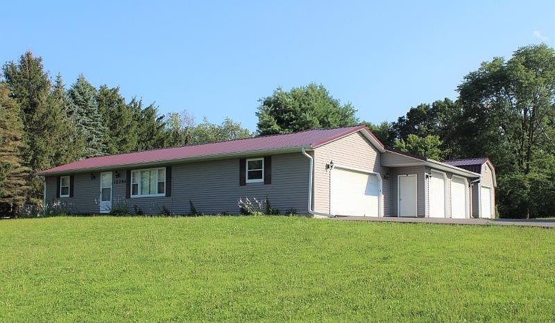 Edge of town location, close to schools, situated on one acre! 2 Bedroom ranch with full basement. 2 heated, attached 2 car garages. The drive was blacktopped in 2021. New lawn mower shed in 2017. In 2013: new steel roof, siding, aluminum soffits and seamless gutters, and new drain field installed. The washer and dryer can be upstairs or down. The rear patio is 12' 6" x 42' and is very inviting. Great offering!