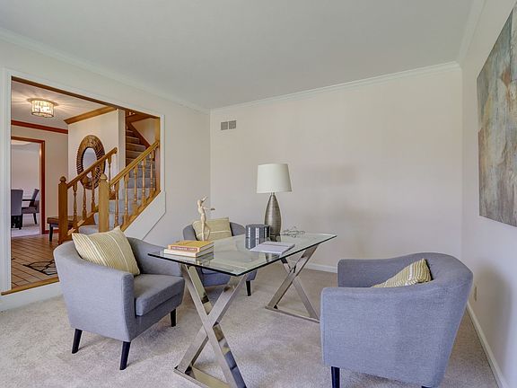 Sought after brick home in popular Springmill Crossing neighborhood. Home has 3 car attached garage and beautiful curb appeal! Open foyer with tile floor leads to home office with wall of windows and formal dining with tray ceiling. Solid wood doors and stunning wood detail thru the home! Family room with coffered ceiling, wainscotting, custom built ins and brick fireplace. Eat in kitchen with breakfast nook overlooking the lush yard! Gourmet kitchen with center island, granite counters, tons of storage and matching appliances. Half bath and conveniently located laundry room with wash sink round out the main level. Upstairs hosts 4 bedrooms. Owners suite with vaulted ceiling, owners bath with double sinks, granite counters, walk in shower, soaker tub and skylight for that spa like feel. Hall bath with double sinks, granite counters and tub/shower combo. Finished basement perfect for second living room or recreation space. Screened in porch with skylights and brick detail. Concrete patio great for sitting outdoors. Rear garden space is ready for you!