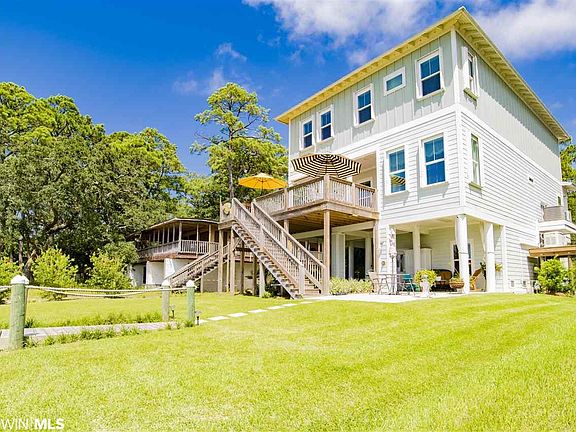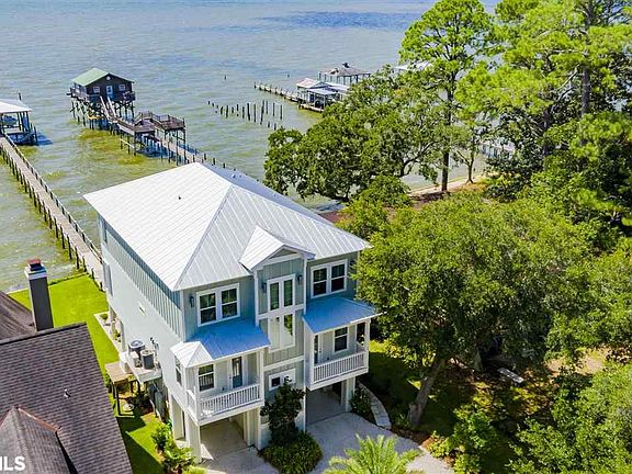 Let's talk about Sunsets, absolutely the most amazing sunsets from this property on Mobile Bay. Bayside Bliss is an almost new, rare GOLD FORTIFIED direct bay front home that sits on a deep lot in the Point Clear Alabama area. Miles of biking, walking & running paths lined by old growth southern oaks dripping in Spanish Moss. This home has gorgeous whitewashed hardwood flooring throughout, a gourmet kitchen with high end Electrolux appliances, separate dinning room, 6 bedrooms, 6 bathrooms, an outside shower, plenty of parking, gas hook ups for grilling on the 1st/2nd floor & wait until you see the huge owners suite with incredible bay views, 2 large walk-in closets, large private owners luxurious bathroom with double vanities, free standing soaking tub & a gorgeous tiled shower for TWO. This home was UPGRADED by current owners with a top of the line Generc whole house generator, metal storm shutters on south/west facing windows, a completely self contained GUESTHOUSE with direct bay-views, elevator lift to the 2nd floor, sun shades on the upper deck, a reinforced seawall, sure-step reinforced pier with wash through decking, a wash through crab deck, an electric boat lift (up to 4,000 lbs), also added was a matching carport with a 5x16 workshop with power/water/RV hook ups & an endless amount of gorgeous landscaping. If you have been looking for a home on the bay look no further. One of a kind newer home has every upgrade you could dream of. There is NOTHING like this on the market in this area. Recent Survey, elevation certificate & super low insurance cost.