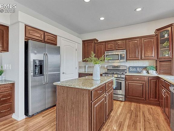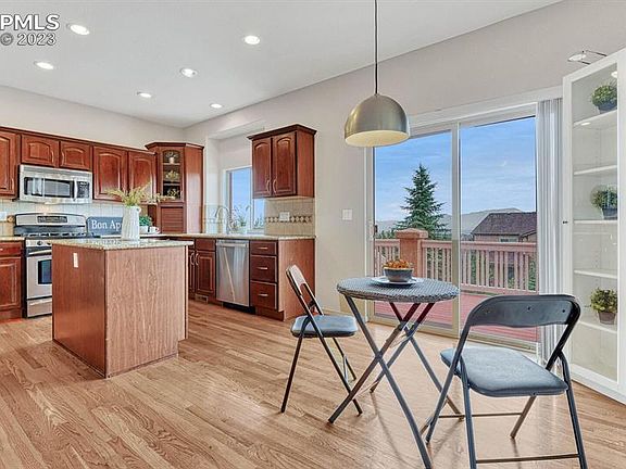 Live the Flying Horse dream & experience breathtaking views of Pikes Peak and the Front Range! This exceptional two-story home, a beloved model of Classic Homes, offers a fully finished walk-out basement, vaulted ceilings, and countless other features. Step onto your back deck to marvel at unobstructed views while enjoying your professionally landscaped yard. New carpet and interior paint make this home feel fresh and inviting. Discover the elegance of French doors opening to your private main level study, offering yet another vantage point of the magnificent Pikes Peak. Adjacent, is a spacious family room boasting gleaming hardwood floors and a cozy gas fireplace. The open kitchen is a chef's delight, equipped with stainless steel appliances a double oven, pantry, granite counters, and a casual dining nook. The formal dining room opens up to a second living room filled with natural light. Last year, the basement was refinished, providing even more versatility and storage space. The laundry room cabinets & extended garage ensure ample storage options. The basement offers endless possibilities, whether you desire a second family room, a home theater, or a game room. In addition to its large bedroom and bathroom, the basement features a sleek and modern wet bar with a refrigerator, perfect for entertaining, or just cozy up to the contemporary gas fireplace. Step outside the walkout basement and immerse yourself in the park-like yard. The primary bedroom impresses with vaulted ceilings, abundant natural light, a 5-piece bathroom, and a walk-in closet with an upgraded closet system. Ideally located in District 20, this home is close to shopping, trails, neighborhood parks, and Fox Run Regional Park. Stay comfortable during hot Colorado days with NEW central AC. Convenience is at your fingertips with quick and easy access to the Air Force Academy, I-25, & Hwy 83. Don't miss out on the opportunity to own this meticulously maintained and extraordinary home!