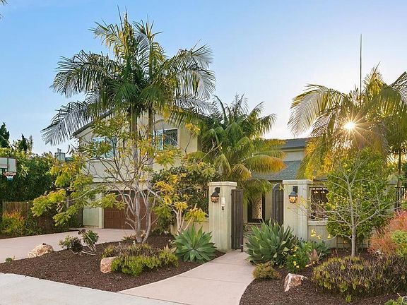 Stunning Del Mar Heights home built in 2014 and nestled W of I-5, boasts an exceptional location, just a short stroll to highly-rated Del Mar Heights Elementary and minutes to the beach, Del Mar Village and Torrey Pines Reserve. A gated entry provides privacy and leads into a lovely courtyard with sitting area and firepit. As you enter the home you'll immediately notice the array of custom features that exude elegance and sophistication. Wide plank engineered wood floors provide a warm ambiance to every room, while built-in shelving add both functionality and style. Downstairs you will find a charming living room with vaulted wood-beamed ceiling and fireplace, and a great room illuminated by large windows and a double set of sliding glass doors that lead out onto a lush backyard. Step outside into your own private oasis where mature fruit trees surround you as you enjoy the sun & cool ocean breeze. Entertain guests around the firepit or challenge them to a game of bocce ball on your very own court! The kitchen is an entertainer’s dream with ample cabinet & counter space, Wolf range, two dishwashers & large center island with sink. Expansive primary suite features huge his-and-hers walk-in closets, fireplace & balcony to capture the beautiful views and sunsets. Primary bathroom with jetted tub, walk-in shower & custom finishes add elegance to every corner. Primary bedroom and office with acoustic insulation, Tesla charging station, upstairs laundry room & AC. Four large bedrooms of which one is located downstairs, a home office and a flex space upstairs (ideal for a game room or reading den), large 8,100 SF lot and a multitude of tastefully selected custom features make this home a true gem and your unique opportunity to live your best life in one of Southern California's most coveted locations!