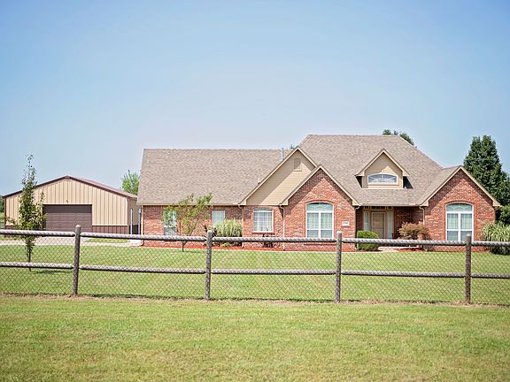 Over 2 ac m/l,tiled entry, wood pellet fire place in living room, upgraded crown molding, 2' blinds, open kitchen w/breakfast nook and bayed window, split bedroom plan, master suite w/private bath, walk-in closet, whirpool bath & separate shower, 4th bedroom could be gameroom up. Fully fenced yard with gated entry with code and automatic gate, 30x30 all steel insulated shop with finished office and large shed. Large outdoor living area with pergola, fire pit and storm shelter. New paint inside, Exterior paint 2 years old. Security system with 2 cameras installed and ready to use as well as a 4 camera video surveillance system with 1Tb hard drive. Call today to schedule a showing Kari 918-619-7472. Will work with buyers realtor.