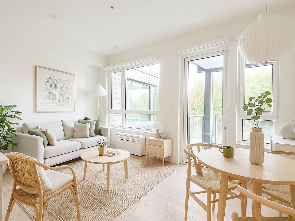 Air conditioningQuartz countertopsSleek two-tone cabinetryGas stoveBright open-concept layoutLandscaped outdoor areas