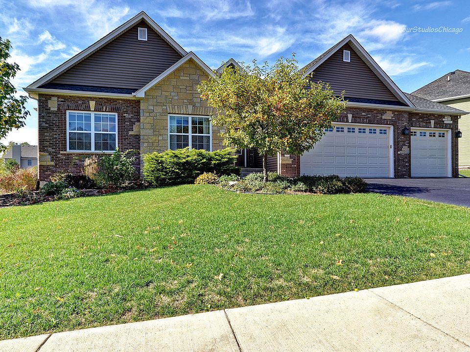 Waiting for the WOW factor in a ranch, you just found it. Inviting elevation with both stone and brick. Wonderful flowing open floor plan features a welcoming foyer with design ceiling and hardwood floors as you enter. The family room focuses on a stone fireplace with vaulted ceiling open to the kitchen enhanced with pantry closet, hardwood floors, back splash, breakfast bar & beverage frig. Table space walks out to the newly surfaced composite deck. The master is a suite with yet another design ceiling and large walk in closet. The perfect functioning master bath has double sinks, tub, separate shower and water closet. Open staircase with iron balusters leads to the finished look out basement perfect for entertaining; stone front bar, recreation room, game room, exercise, 4th bedroom and stunning full bath. Backs to open space with walking/bike path. Neighborhood parks. Don't miss out.