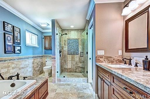 Beautiful, spacious, expanded America's model located in Sol Vista, the highly desired westside of Westminster. This is a two-story, 4 bedroom, 3 1/2 bath home w/2 master suites, one up & one down. The expanded upstairs master has recessed lighting, walk-in closet, large shower, jacuzzi tub, custom vanity w/marble top and Travertine tile floor; the downstairs master has a full bath and walk-in closet. This home has crown moulding, 5" baseboards and plantation shutters throughout; the kitchen has been remodeled and includes a built-in Sub-Zero refrigerator; the furnace has been relocated to the attic and includes air conditioning; the family room has built-in cabinets, recessed lighting and the highly desired brick fireplace at the end of the room. Wood floors are in the kitchen and entry and the upstairs is original hardwood floors; the upstairs master is carpeted. There is an extra large "Tuff Shed" workshop in the back and side yard, complete with electricity, window and dutch door. (RLNE1902872)