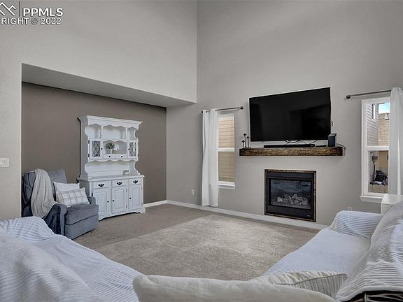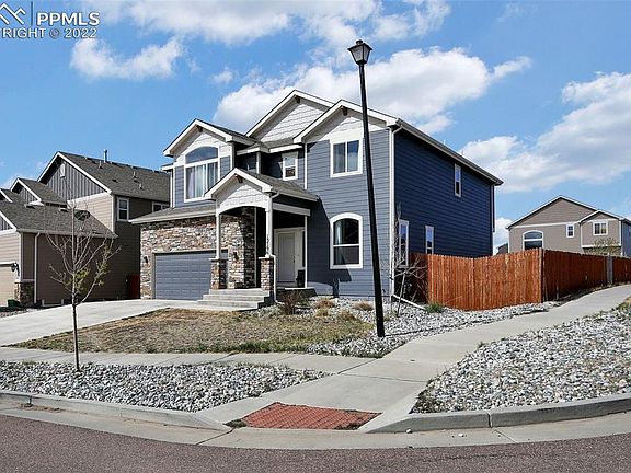 Gorgeous home in the desirable and expanding Meridian Ranch, a HIGHLY coveted Saint Aubyn - Burgess home with oodles of upgrades situated on a large corner lot. This beautiful home is an entertainers delight, you will love the open floorplan flooded with natural light. As you enter the house the entry offers a farmhouse chic feel and formal dining room (currently being used as an office) with an attached Butler's Pantry. Stainless Steel appliances, white farmhouse cabinets, large island offering additional seating, and granite countertops makes this a chefs dream. Vaulted ceilings and a spacious loft overlooking the family room offers plenty of opportunity for an office space, hobby/craft area, or a fun hang-out space. The master bedroom is a retreat within itself with a sitting area, double-sided fireplace, soaking tub and large walk-in closet. The laundry is located upstairs in a designated laundry room. Two additional bedrooms, and a full-size bathroom round out the upstairs. Unfinished basement currently offers workout space and tons of storage. Close to shopping, Falcon schools, walking paths and the Community Recreation Center with a pool and fitness center.