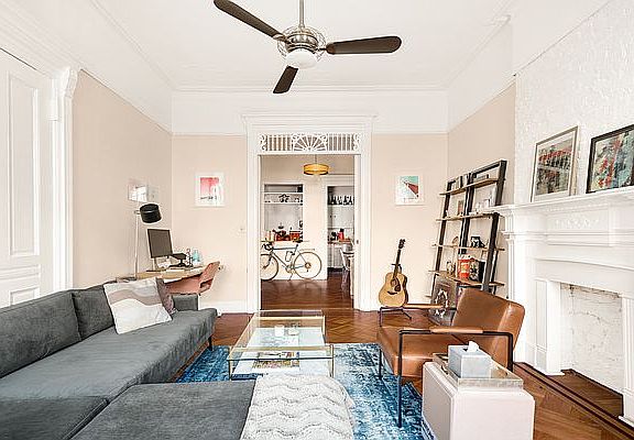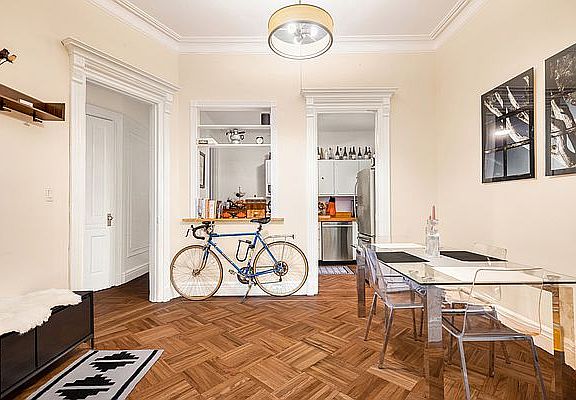 PARLOR PERFECTION Wonderfully oversized parlor floor apartment replete with original details in a handsome 21ft wide brownstone on a picturesque tree-lined block of Berkeley Place in the Park Slope historic district. Grand proportions (21.33 wide X 66ft long!!) and classic brownstone features including an 11ft high ceiling, carved wood doors and frames, parquet flooring, decorative fireplaces, 8ft tall windows and crown moldings throughout. The front of this parlor floor is dedicated to living and dining areas, separated by original pocket doors. A sizable kitchen with pass through window and breakfast bar has stainless steel appliances (including a dishwasher), butcher block counters and a ceiling fan. Off the main hallway is a coat closet and a full size laundry room with washer/dryer and slop sink. In the rear, the king-sized primary bedroom has superb southern sunlight, garden views, ceiling fan, beautiful exposed brick wall and the ultimate NYC dream - a huge dressing room with two large closets! The secondary bedroom with painted brick wall is perfect for guests, home office or gym. This pet friendly apartment is situated on a stunning tree-lined street in a fantastically convenient North Slope location, between 6th and 7th Ave, within a few blocks of Prospect Park and the B,Q,2,3 trains. The Park Slope Food Coop is on the next block down and there is even a charming coffee shop and CitiBike station right down the street. This is truly an exceptional apartment in a first class Brooklyn location. Available June 1st. Pets and guarantors allowed. CONTACT BROWN HARRIS STEVENS EXCLUSIVE BROKER FOR AN APPOINTMENT