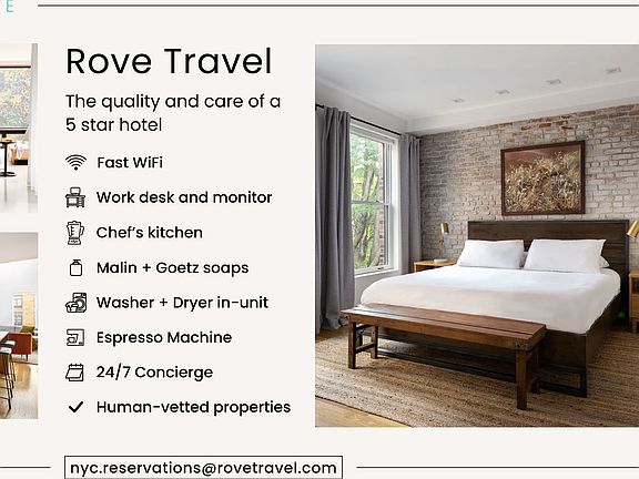 Rove Travel offers luxury, furnished residences for flexible-lease terms of 30+days or more. Rates vary by season, stay length, and move-in and move-out dates. Brokers are welcome! We pay 5% commission on the rent. *About The Property:* Welcome to Willow Loft, a bright and spacious open space reimagined into a two-bedroom loft in vibrant Williamsburg. This home boasts expansive, almost floor-to-ceiling windows that fill the space with sunlight, highlighting the semi-industrial design and rich wood accents. Each bedroom features a king-sized bed, ample workspace, and an ensuite bathroom with a tub, providing privacy and relaxation. The living area is equipped with a plush sofa, built-in storage, a TV, and city-view windows perfect for people-watching. Musicians will appreciate the piano and acoustic guitars ready for use. The kitchen offers a breakfast bar, open-style cabinets, and a full set of appliances, ideal for home-cooked meals. *Room Configuration:* - Primary Bedroom: 1 king bed - Bedroom 2: 1 king bed *About Rove Travel:* Rove provides premium residences for the modern traveler. Our properties are fully equipped for relaxing, living, working and entertaining. All residences meet Rove's luxury standard with professionally designed furnishings, chef's kitchens, high speed internet, ergonomic workstations, and often outdoor space. Rove's concierge team is available with a 24/7 concierge for all needs. *Amenities:* - Remote-work friendly properties including: 300+ mbps WiFi throughout the property, workstations with ergonomic chairs, high-definition monitor with integrated docking station, and wireless keyboard and mouse. - The concierge team is available 24/7 to assist you with scheduling Rove's housekeeping services, maintenance, and local recommendations. - Fully-stocked chef's kitchen, Nespresso machines, luxury linens, and Malin & Goetz soaps. - TVs are powered by Roku with included access to Netflix, Hulu + Live TV, and Disney+. - Family friendly properties. Cribs are available at an additional cost. - Washer/dryer for the property is located in the building. - Pets are allowed at this property for an additional fee. *Home Truths:* There is a washer/dryer located in the building and can be accessible for guests to use. *Ideally Located:* Williamsburg is a hip neighborhood in Brooklyn that draws the young and the fashionable to its chic boutiques, trendy cafes and buzzy restaurants. Street art brightens residential thoroughfares and repurposed factories, while the waterfront provides stunning views of Manhattan and seasonal venues for outdoor concerts and food markets. Dance clubs, happening bars and music halls liven up the nightlife scene. *Other Things To Note:* Refer a property to Rove, get up $7,000 in cash. Terms and conditions apply. Email realestate @ rovetravel com with the property address for confirmation on referral eligibility. Pets are allowed at this property for an additional $300 fee. Rove requires a property rental agreement to be signed by the primary guest prior to arrival for all reservations at this home. Please note that this property requires a $5,000 credit hold for stays of less than 90 nights and $10,000 for stays of 90 nights or longer. This security deposit is facilitated after a booking is confirmed as a credit card hold taken 2 days prior to arrival and released 2 days after departure. As a reminder, smoking is not allowed anywhere on the property, in the home or in the outside areas of the home. Smoking will result in a odor removal fee of no less than $500 and up to $1,000 as well as possible removal from the property.