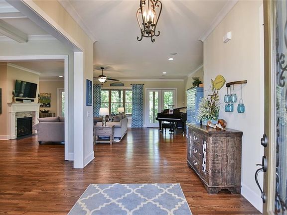 You will be welcomed by the first sight of this gorgeous five-bedroom, four bath, two half bath home in immaculate condition, and ready to move in. A concrete drive entrance brings you to the door of this beautiful home with attached 2-Car garage. You will be intrigued by the gorgeous landscaping as well as the home's stone, and cement plank exterior finish. Upon entering the front entrance grandeur will greet you with a bright, open-space floor plan. The main level flows seamlessly together through the living, dining, and kitchen areas which feature brilliant hardwood flooring. Bright sunlight fills each room from either side of the house. The spacious great room features a lovely fireplace, and an Entrance/Exit to outdoor deck/balcony and screened porch. Surround sound wiring throughout the home makes a great feature for entertaining, enjoying great music while working, or leisurely relaxing. This system also pipes to outdoor speakers to be enjoyed while grilling from the balcony or relaxing in outdoor space. You will find crown molding throughout this home, including areas you may not expect. Attention to detail was not missed in the construction of this design. A spacious kitchen comes complete with upgraded granite countertops, and soft-close cabinetry; both features which are continued throughout the home. Appliances include: Bosch double oven, Bosch gas stove, Bosch dishwasher, drop-in microwave, and Samsung refrigerator. The kitchen also features a Breakfast area, a bar seating area, and a bar for entertaining. Hall area just off kitchen leads to a Pantry, a half bath, laundry room, and Entrance/Exit to garage. The garage features a small workshop. To the right of the home's front entrance you will find a bedroom with walk-in closet, and full bath, including, walk-in shower, and tile flooring. Spacious main level Master Bath also found to the right of front entrance includes: conference ceiling design, 2 large walk-in closets, spacious master bath, tile flooring, double vanities with sinks, walk-in shower, and jetted tub. From main living area follow the wood staircase with iron spindles down to the basement where you will find a large open space entertainment room complete with a bar. To the left of this room is a full bath with tile floor, and a carpeted bedroom with walk-in closet, and a lake view. There is a hall leading to gym/fitness room, and a craft room. You can find lots of closet storage throughout the home. Tile floor throughout main basement offers a great touch to this space overall. Basement also offers a utility room off main area. Two carpeted bedrooms to the right of main basement feature spacious area, and walk-in closets. Down the hall where bedrooms are located is a wine room, and full bath with double sinks, and walk-in shower. Outdoor patio with stairs leading to main level balcony above is placed just outside main basement entertaining area. This area also leads to flagstone walk and fire-pit, beautiful landscaping, and steps leading down to covered dock and lake. The backyard also features landscape lighting, multi-tier design retaining wall descending toward the lake, and several seating areas from which to enjoy the majestic outdoor splendor of this quiet lake oasis. Don't miss your chance as this property is a must see!
