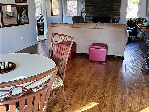 3/2 home with winter mountain view. Laminate floors, carpet, tile, WI closet, WI shower, beautiful stone fireplace (propane), open floor plan, divided bedrooms, springtime backyard has a variety of flowers, backyard deck and front deck, partially fenced in yard, great workshop attached to carport. Refrigerator conveys with sale. Replaced all plumbing 2018, added leaf guards. All furnishings for sale also. House price $135,000 and with all furnishings $145,000. View home before it sells.