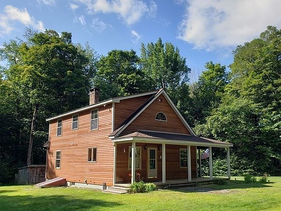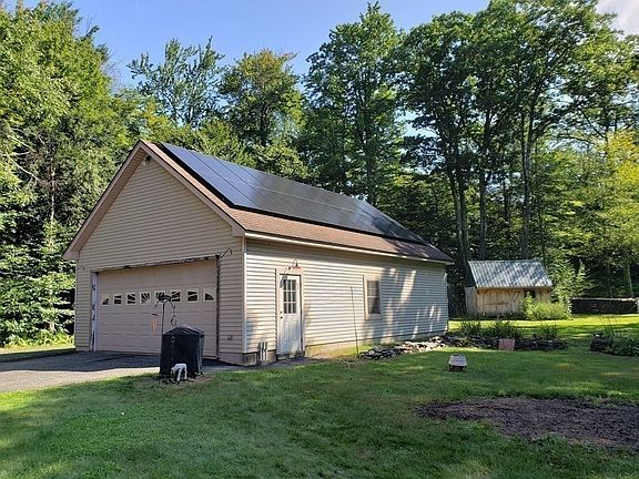 In the foothills of the Berkshires you will find this private, cedar sided country cape, tucked up off the road & set on over 7 acres of land. Spacious & charming, this home offers many extras & terrific upgrades. On the main level you have a newer kitchen w/granite counters & stainless-steel appliances, large living room, formal dining rm w/pellet stove, a half bath, laundry & 1 bedroom. The 2nd floor has a full dormer in the back & dormered windows in the front allowing for 2 huge bedrooms & large full bath w/ceramic tile floor. The backyard is serene & private. The detached garage is massive in size with front and back overhead doors & comes complete w/workbenches, cabinets, Craftsman tool boxes, wall mount TV, speaker system, propane heat, 220 hook up w/ air compressor to stay. Other features include Screened porch, generator panel, solar power, central vac, central air, partially finished basement w/pellet stove & an awesome workshop. Chicken coops & 2 barn style storage sheds.