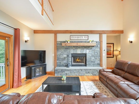 Elegant Contemporary Colonial in South Rehoboth - Built in 2007, this distinct four bedroom home offers a wealth of space, light, and privacy. The property is designed with a main level open concept decorated with cathedral ceilings, a wealth of windows, exposed beams, two-sided fireplace, eat-in kitchen with island, formal dining room, and access to a recently expanded back deck. In addition, the first floor features a primary bedroom suite complete with a fireplace and a tastefully renovated bathroom with a custom shower. The upper level includes three additional bedrooms with an additional second floor bedroom suite with its own full bath. The finished walk-out lower level provides additional living space ideal for a home gym, office, or game room. The property also includes a Generac generator, central A/C, and a reverse osmosis filtration system. Taste and refinement abound in this modern yet classic residence in a lovely rural setting.