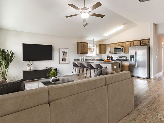 Spacious breakfast islandGranite countertopsPrivate fenced yardModern accent wallModern wood-look flooringOpen patioTray ceiling