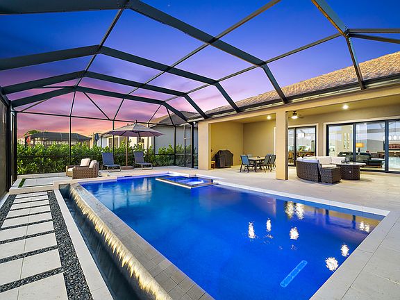 Built in 2019, impeccable Stonewater model by DiVosta at Sonoma Isles offers you split floor plan with 3 BR, 3 full baths 26' deep 2 car plus golf cart garage on a premium lot location with SW long lake views & magnificent sunsets. Custom designed, heated salt-water infinity pool and spa controlled from your phone app, panoramic screen enclosure and large covered lanai which is pre-plumbed for an outdoor gas kitchen. The open concept floor plan features a gourmet chefs' kitchen with natural gas 36'' cooktop, 42'' Alabaster cabinets, Minerva Cream quartz countertops, under cabinet lighting, large island with contrasting Brown Sugar cabinetry, large walk-in pantry and Kitchen Aid SS appliances. Featuring 9''x40'' porcelain wood grain tile throughout home, LED lighting & in wall pest control
