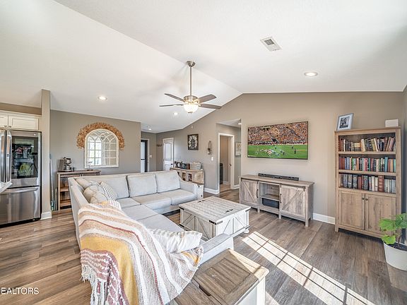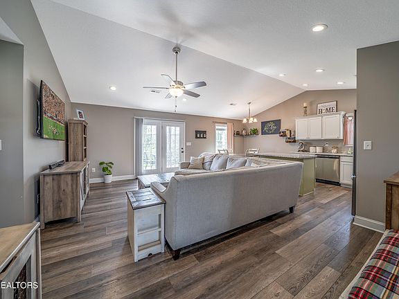 Immerse yourself in a quaint country setting while being conveniently close to everything in this peaceful Heather Run neighborhood!! A unique embrace of quiet pastoral landscapes, this gorgeous 3 bedroom, 2 bath home combines scenic views with sleek, contemporary living. Tasteful landscaping and attached 2-car garage are your first glimpses of this single-story stunner. Stone accents richly highlight the home's modern-farmhouse façade and provide a pleasantly memorable first impression. The charming front porch leads to the formal entryway which showcases an open layout with vaulted ceilings, perfectly capturing the views from its large windows and French doors. The kitchen is perfect for entertaining with its handsome shaker cabinets, stainless steel appliances and gracious counterspace including a newly painted center island. The spacious yet cozy living and dining areas are flooded with natural light, and the floor plan here flows easily outside to the rear backyard and patio. This generous 1200sqft home offers three bedrooms in a split bedroom layout, separating the primary suite from the secondary bedrooms for enhanced privacy. The tranquil primary suite is complete with a beautiful ensuite bathroom with walk-in closet. Down the hall, both additional bedrooms offer a striking serenity and nice storage with closets boasting doubles doors for enhanced viewing of your wardrobe. The full bath is central to both bedrooms and has been updated with a newly painted vanity. Across the hall is the dedicated laundry room. This house is all set with brand new hot water heater and AC, bringing peace-of-mind to everyday living. Located just a few miles to Norris Lake and a short drive to Knoxville, this is property is a must-see!! Buyer to verify all information.