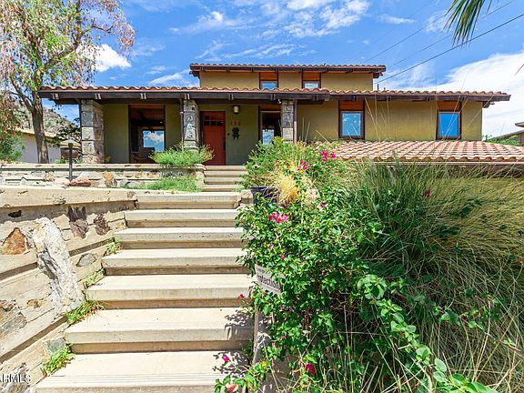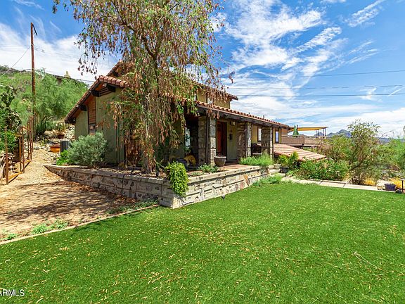 Charming, one of a kind Mid Century, unique Frank Lloyd Wright inspired home and property. Designed by a previous owner who was an architect and student of the Frank Lloyd Wright School. Stone work shows similarities to Taliesin West throughout. 2 bedrooms, 2 baths, plus a den (office). beautiful wood floors .Property has a stand alone building that can be used an art studio or workshop. Amazing mountain views as well as city views from this property.